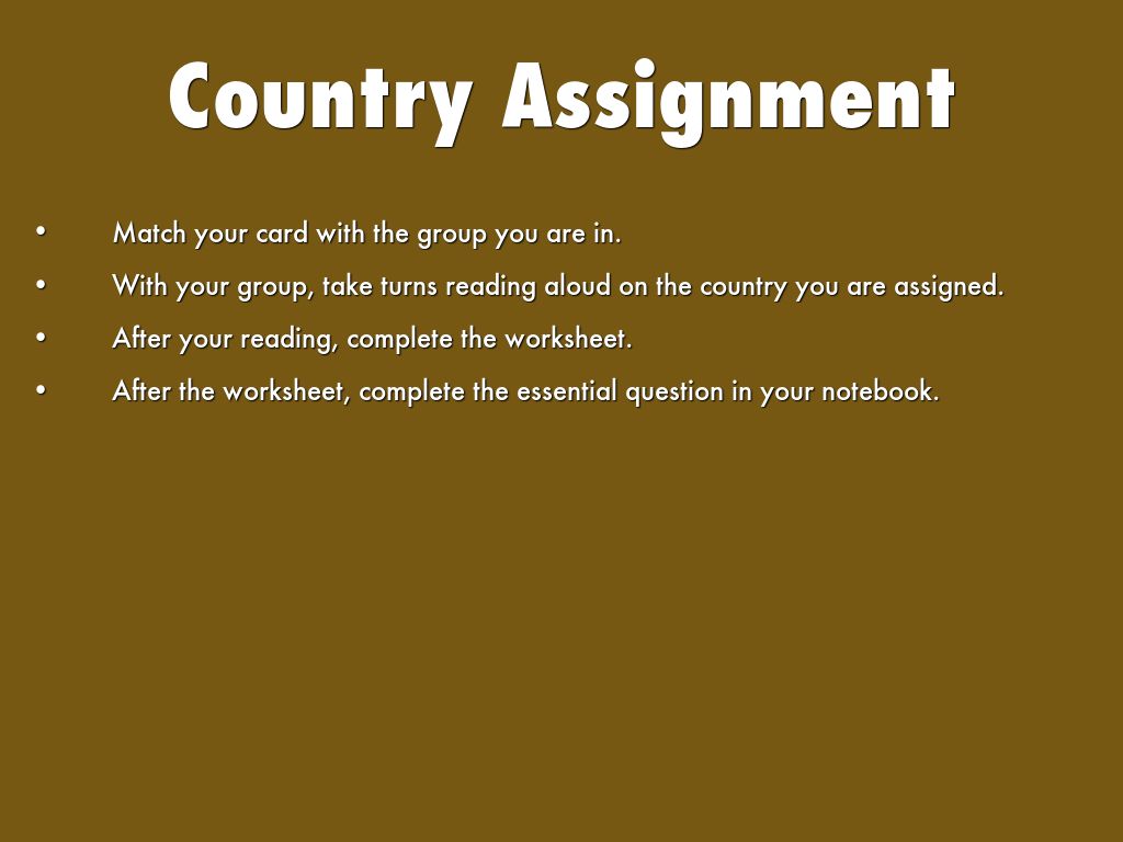 With your group, take turns reading aloud on the country you are assigned.