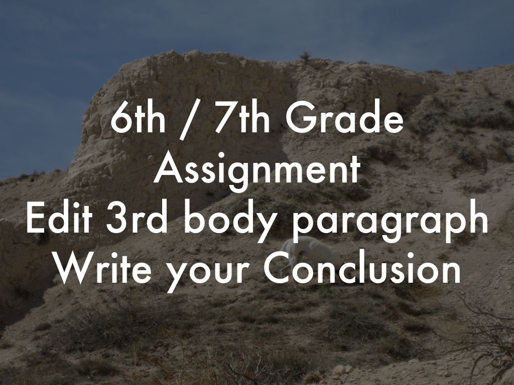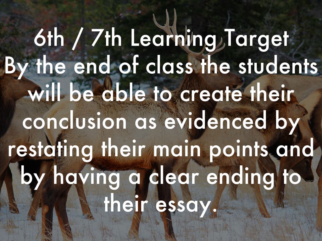 6th / 7th Learning Target By the end of class the students will be able to create their conclusion as evidenced by restating their main points and by having a clear ending to their essay.