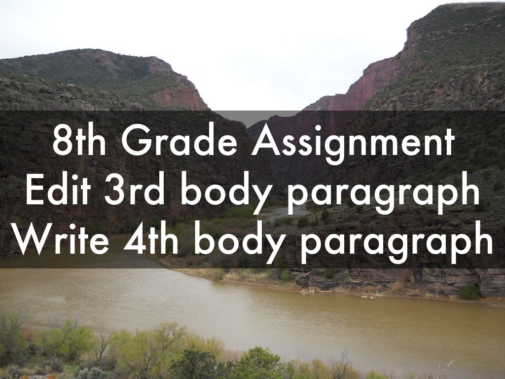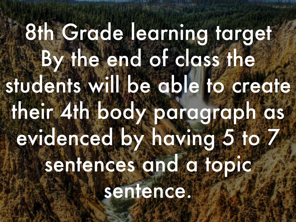 8th Grade learning target By the end of class the students will be able to create their 4th body paragraph as evidenced by having 5 to 7 sentences and a topic sentence.