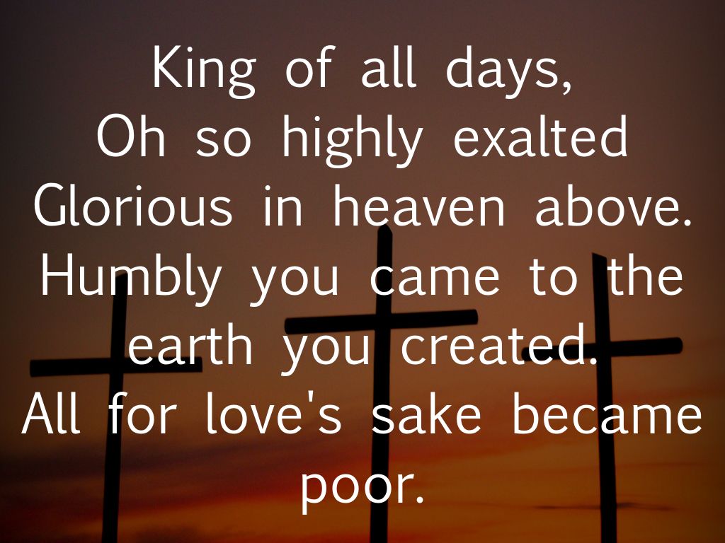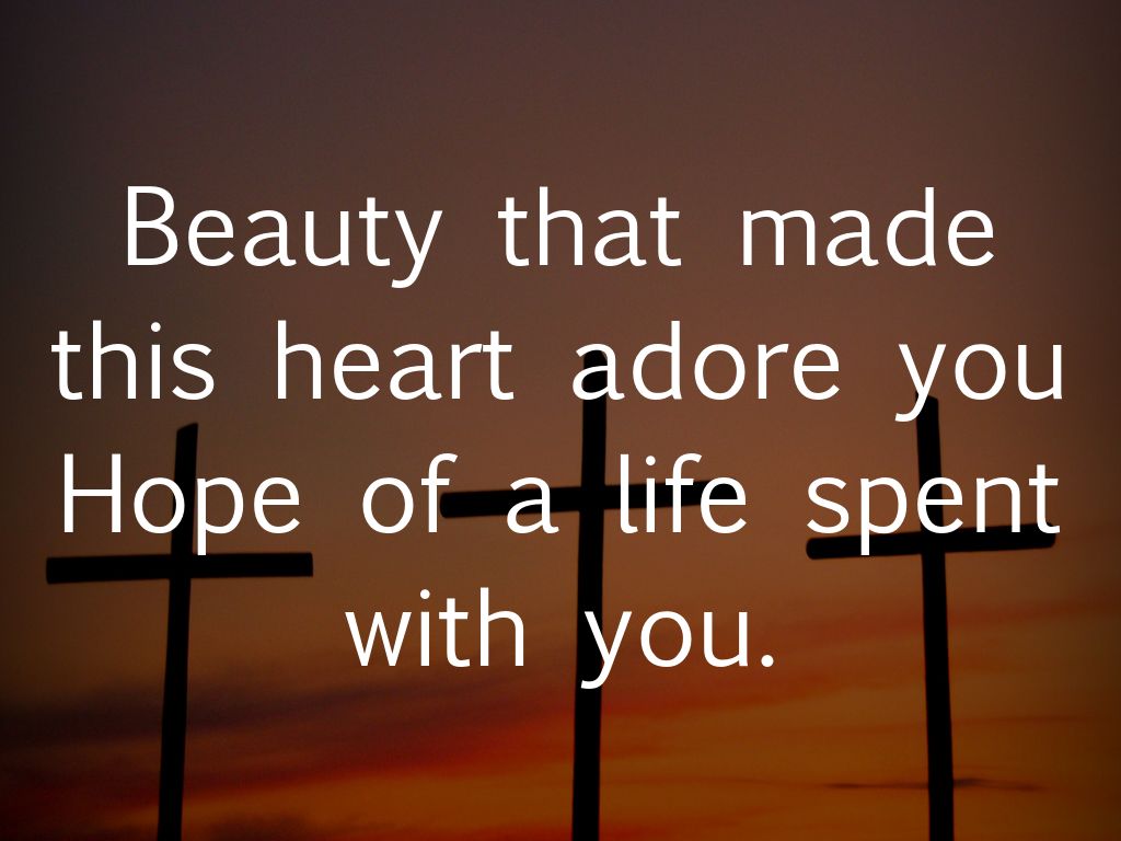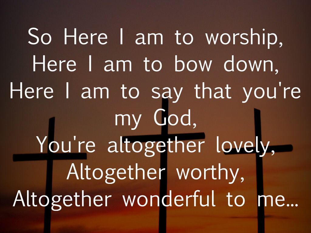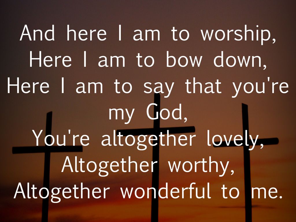 So Here I am to worship, Here I am to bow down, Here I am to say that you're my God, You're altogether lovely, Altogether worthy, Altogether wonderful to me...