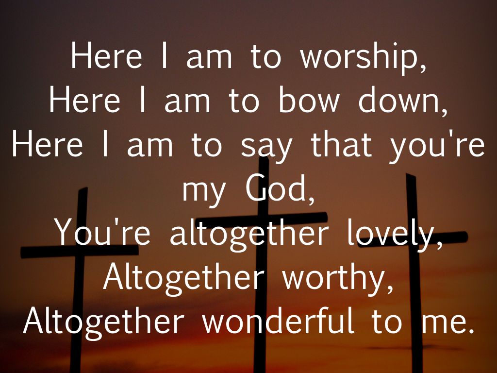 Here I am to worship, Here I am to bow down, Here I am to say that you're my God, You're altogether lovely, Altogether worthy, Altogether wonderful to me.