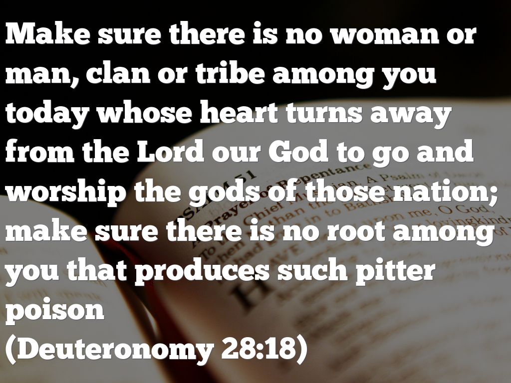 Make sure there is no woman or man, clan or tribe among you today whose heart turns away from the Lord our God to go and worship the gods of those nation; make sure there is no root among you that produces such pitter poison