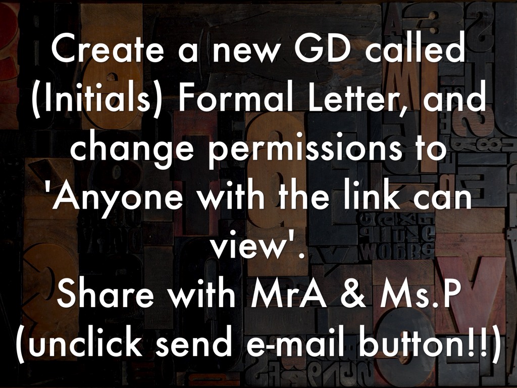 Create a new GD called (Initials) Formal Letter, and change permissions to 'Anyone with the link can view'. Share with MrA & Ms.P (unclick send e-mail button!!)