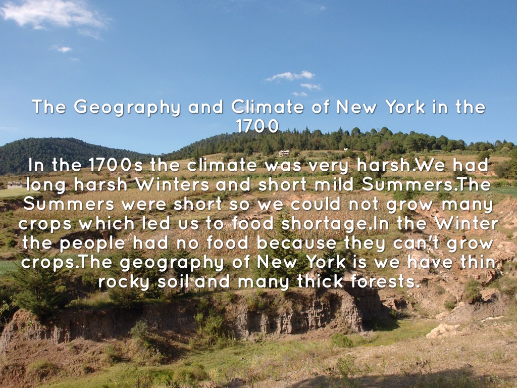 In the 1700s the climate was very harsh.We had long harsh Winters and short mild Summers.The Summers were short so we could not grow many crops which led us to food shortage.In the Winter the people had no food because they can't grow crops.The geography of New York is we have thin rocky soil and many thick forests.