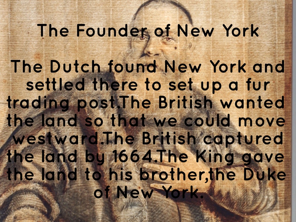 The Dutch found New York and settled there to set up a fur trading post.The British wanted the land so that we could move westward.The British captured the land by 1664.The King gave the land to his brother,the Duke of New York.
