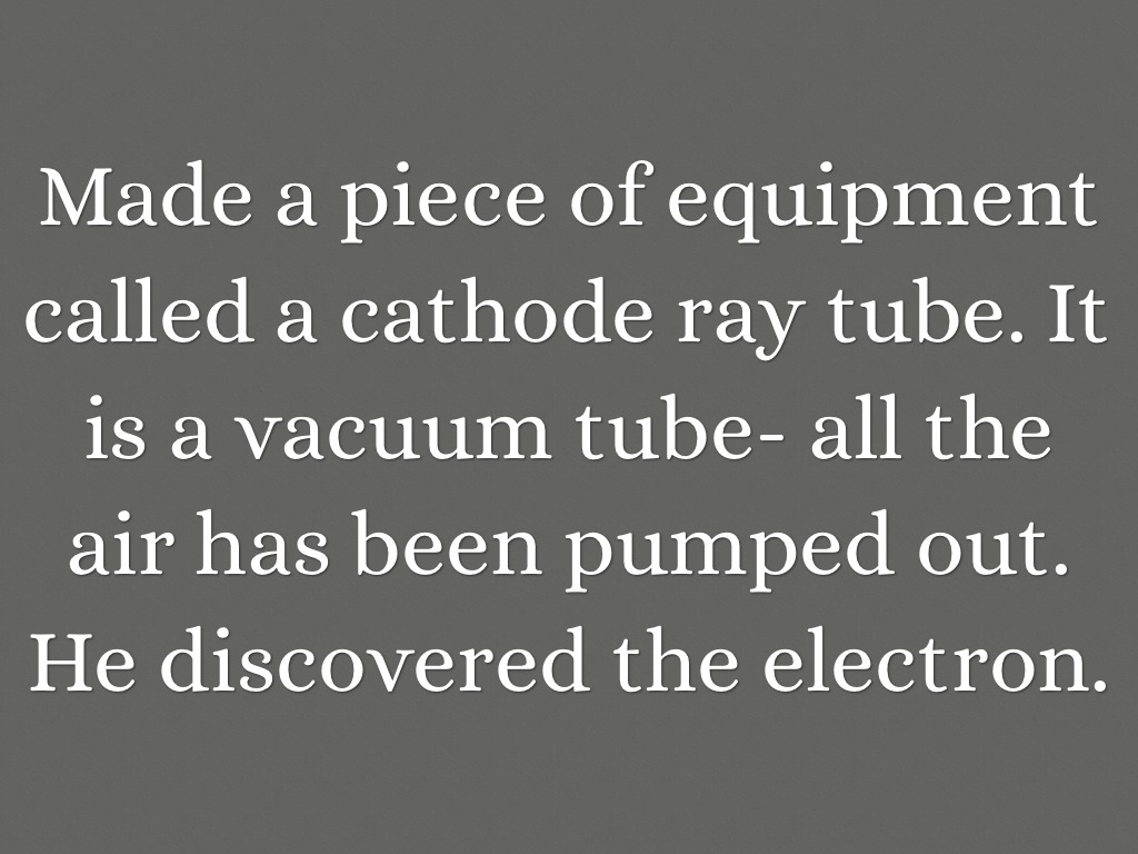 Made a piece of equipment called a cathode ray tube. It is a vacuum tube- all the air has been pumped out.