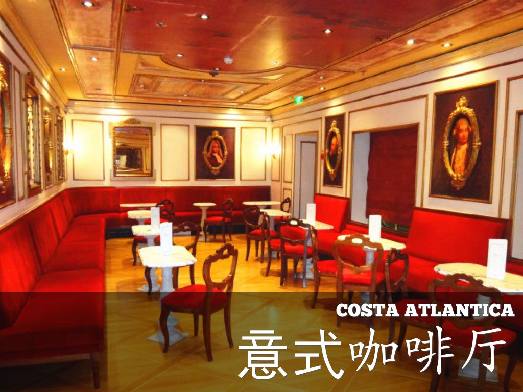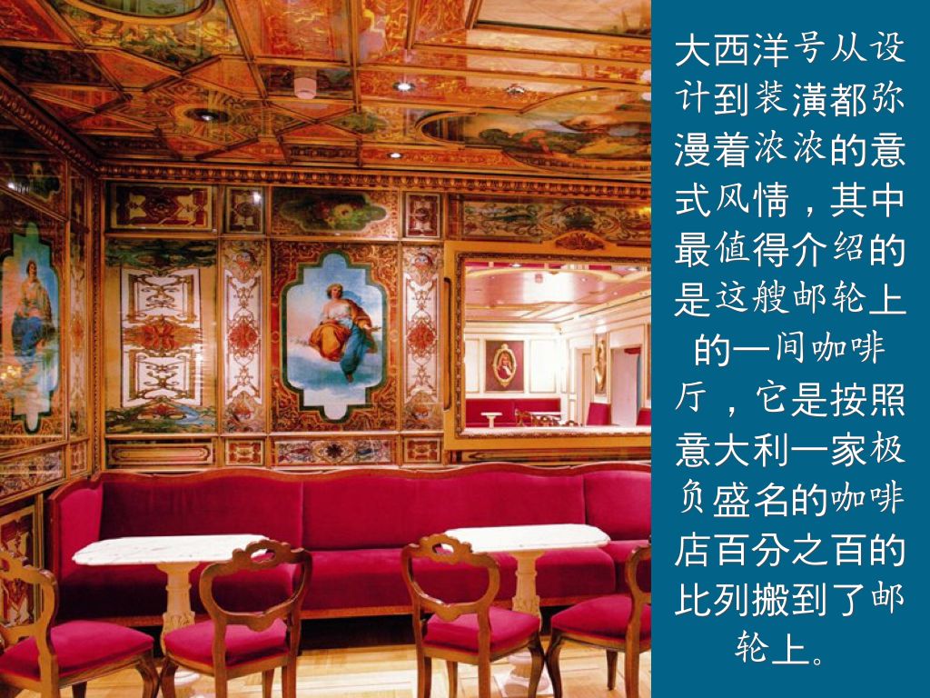 大西洋号从设计到装潢都弥漫着浓浓的意式风情,其中最值得介绍的是这艘邮轮上的一间咖啡厅,它是按照意大利一家极负盛名的咖啡店百分之百的比列搬到了邮轮上。