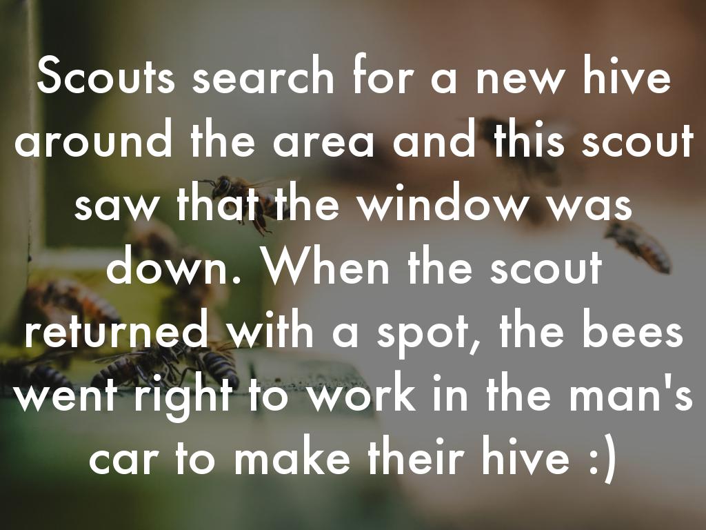 Scouts search for a new hive around the area and this scout saw that the window was down. When the scout returned with a spot, the bees went right to work in the man's car to make their hive :)