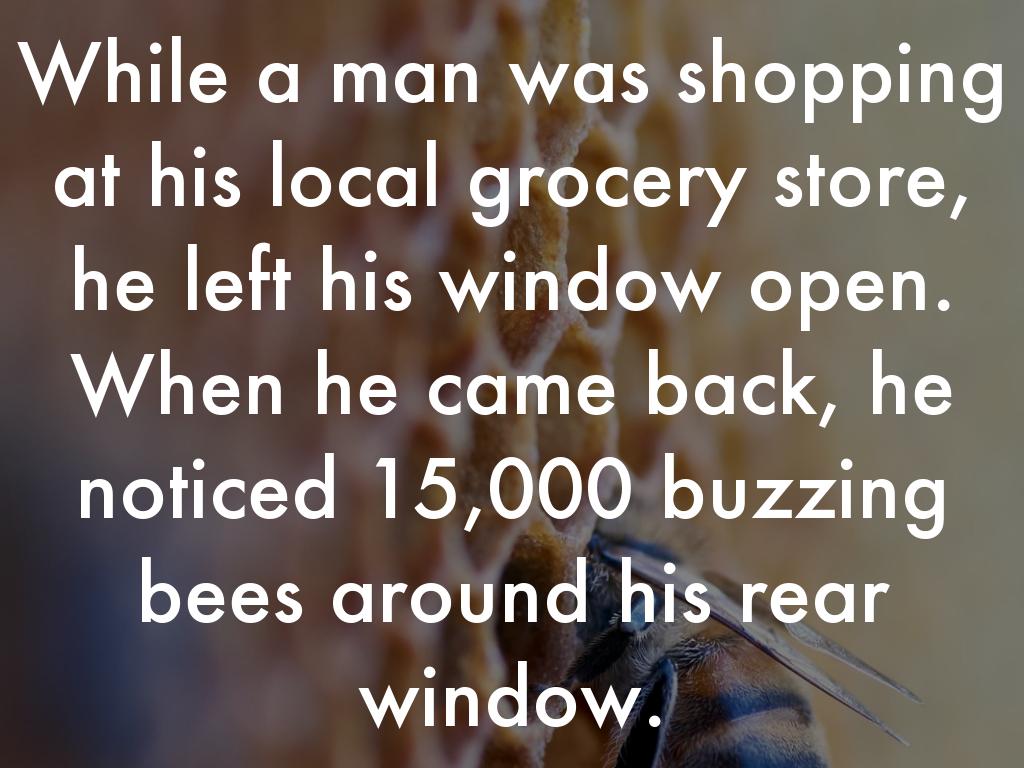 While a man was shopping at his local grocery store, he left his window open. When he came back, he noticed 15,000 buzzing bees around his rear window.