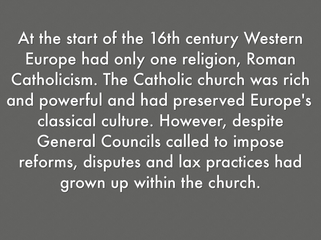 At the start of the 16th century Western Europe had only one religion, Roman Catholicism. The Catholic church was rich and powerful and had preserved Europe's classical culture. However, despite General Councils called to impose reforms, disputes and lax practices had grown up within the church.
