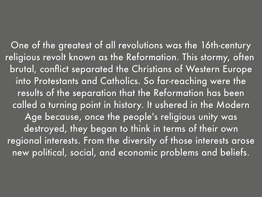One of the greatest of all revolutions was the 16th-century religious revolt known as the Reformation. This stormy, often brutal, conflict separated the Christians of Western Europe into Protestants and Catholics. So far-reaching were the results of the separation that the Reformation has been called a turning point in history. It ushered in the Modern Age because, once the people's religious unity was destroyed, they began to think in terms of their own regional interests. From the diversity of those interests arose new political, social, and economic problems and beliefs.