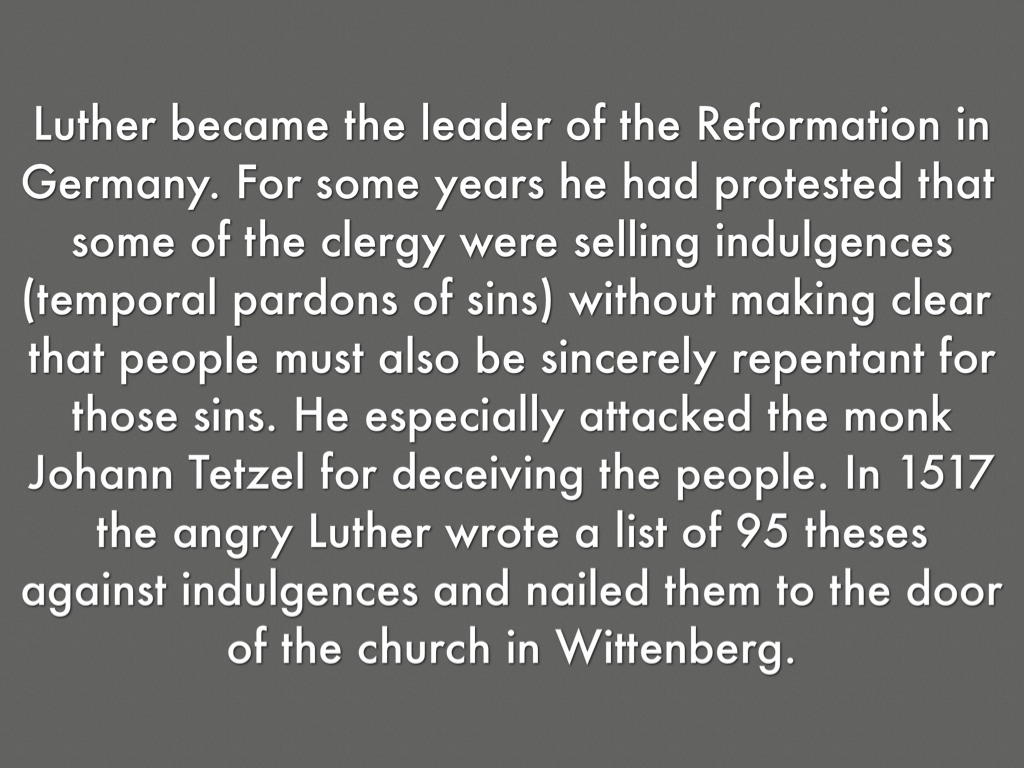Luther became the leader of the Reformation in Germany. For some years he had protested that some of the clergy were selling indulgences (temporal pardons of sins) without making clear that people must also be sincerely repentant for those sins. He especially attacked the monk Johann Tetzel for deceiving the people. In 1517 the angry Luther wrote a list of 95 theses against indulgences and nailed them to the door of the church in Wittenberg.