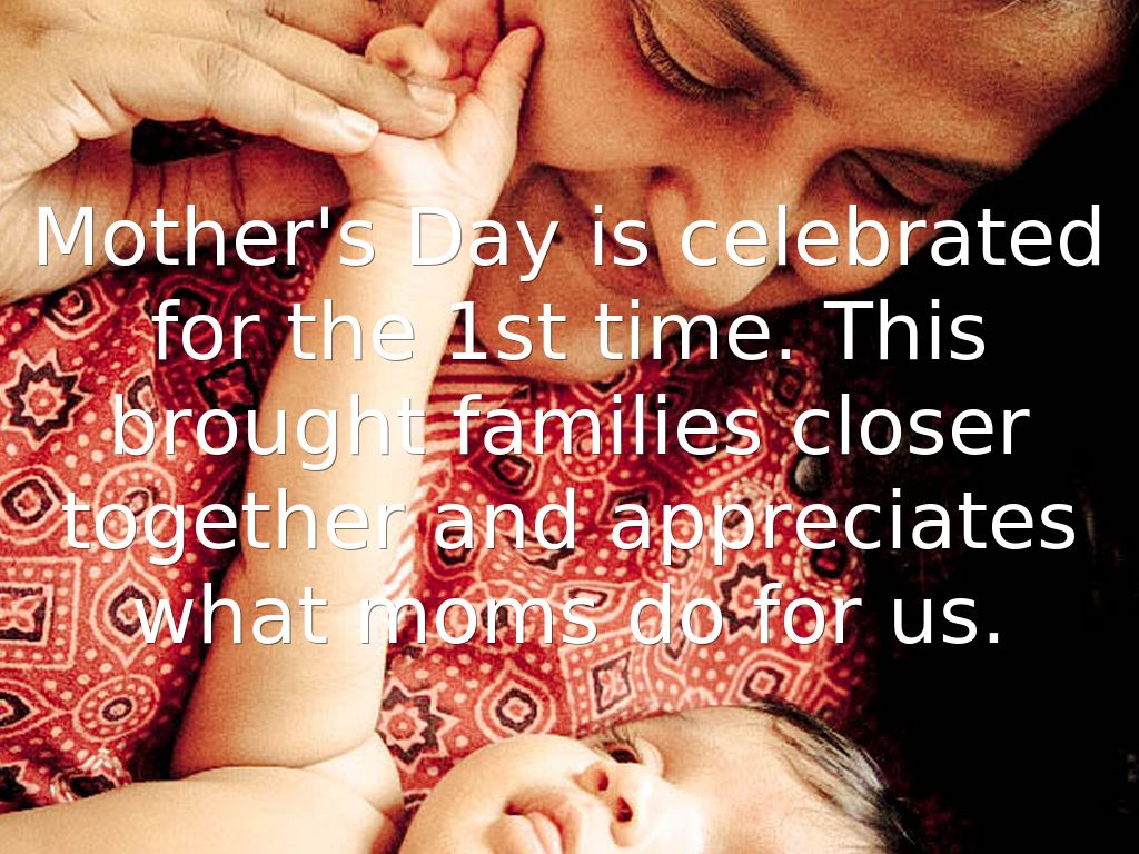 Mother's Day is celebrated for the 1st time. This brought families closer together and appreciates what moms do for us.