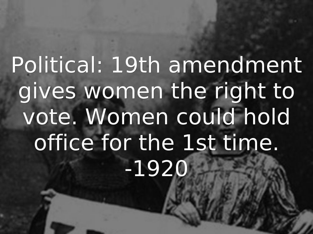 Political: 19th amendment gives women the right to vote. Women could hold office for the 1st time. -1920