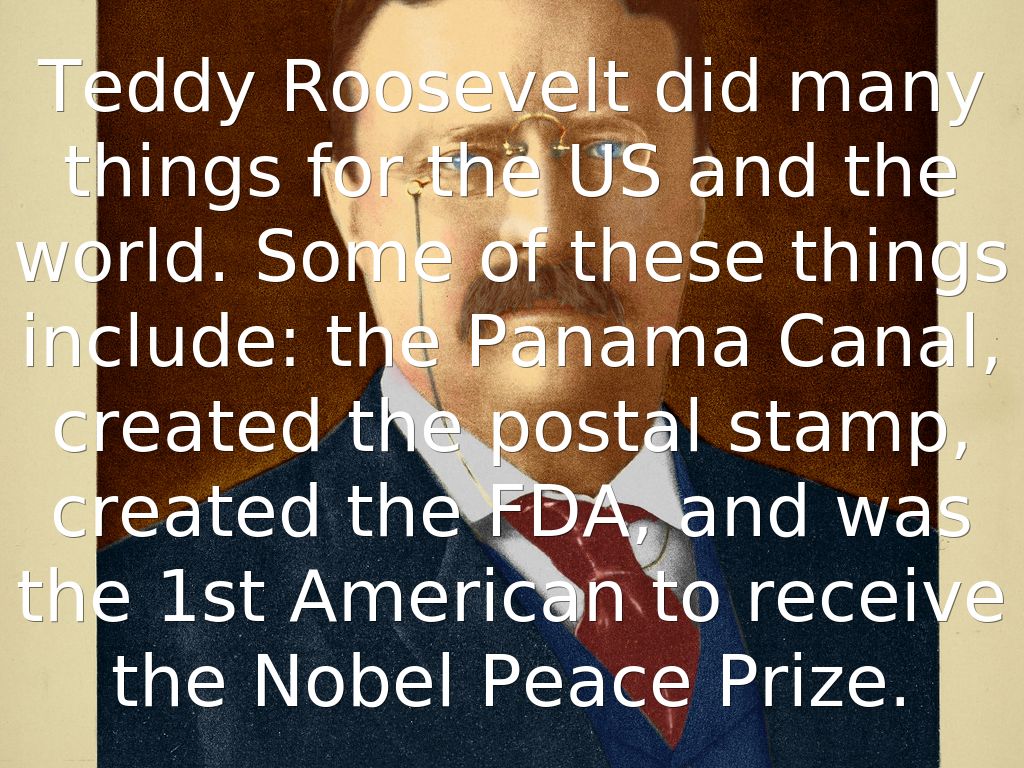 Teddy Roosevelt did many things for the US and the world. Some of these things include: the Panama Canal, created the postal stamp, created the FDA, and was the 1st American to receive the Nobel Peace Prize.