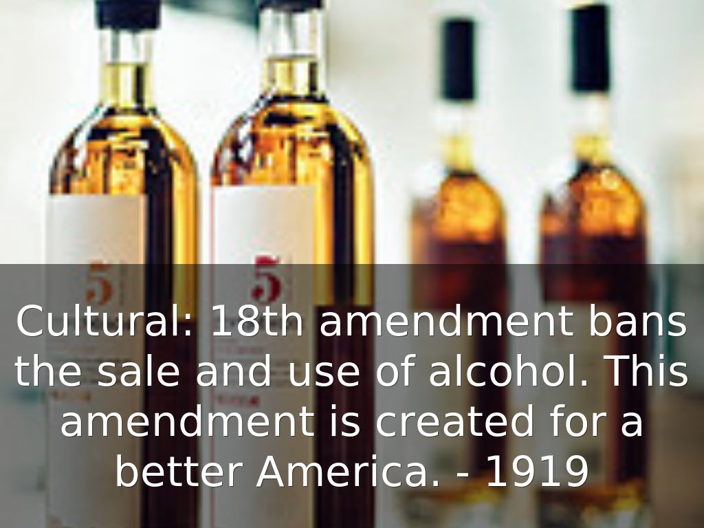 Cultural: 18th amendment bans the sale and use of alcohol. This amendment is created for a better America. - 1919