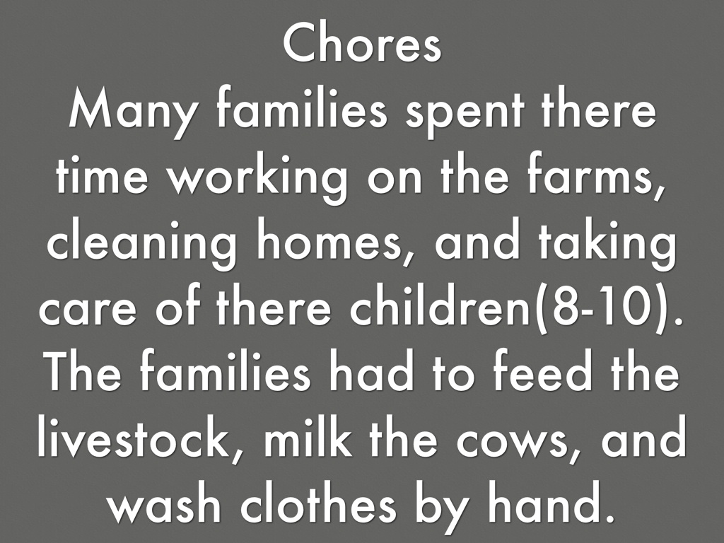 Many families spent there time working on the farms, cleaning homes, and taking care of there children(8-10). The families had to feed the livestock, milk the cows, and wash clothes by hand.