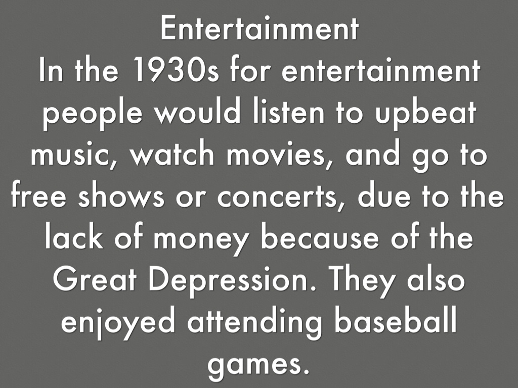 In the 1930s for entertainment people would listen to upbeat music, watch movies, and go to free shows or concerts, due to the lack of money because of the Great Depression. They also enjoyed attending baseball games.