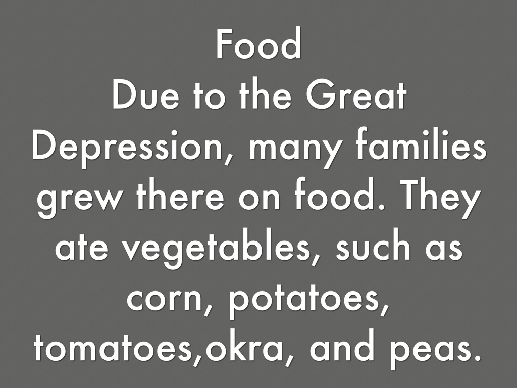 Due to the Great Depression, many families grew there on food. They ate vegetables, such as corn, potatoes, tomatoes,okra, and peas.