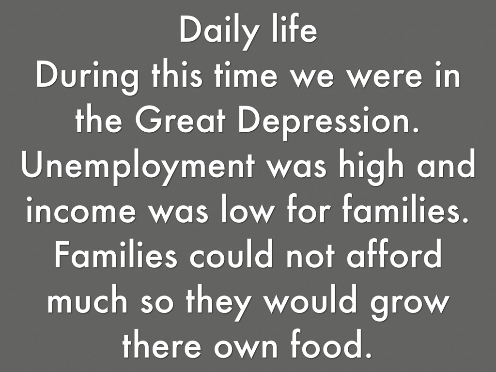 During this time we were in the Great Depression. Unemployment was high and income was low for families. Families could not afford much so they would grow there own food.