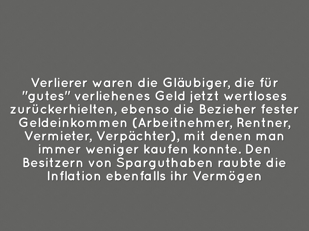 Verlierer waren die Gläubiger, die für "gutes" verliehenes Geld jetzt wertloses zurückerhielten, ebenso die Bezieher fester Geldeinkommen (Arbeitnehmer, Rentner, Vermieter, Verpächter), mit denen man immer weniger kaufen konnte. Den Besitzern von Sparguthaben raubte die Inflation ebenfalls ihr Vermögen