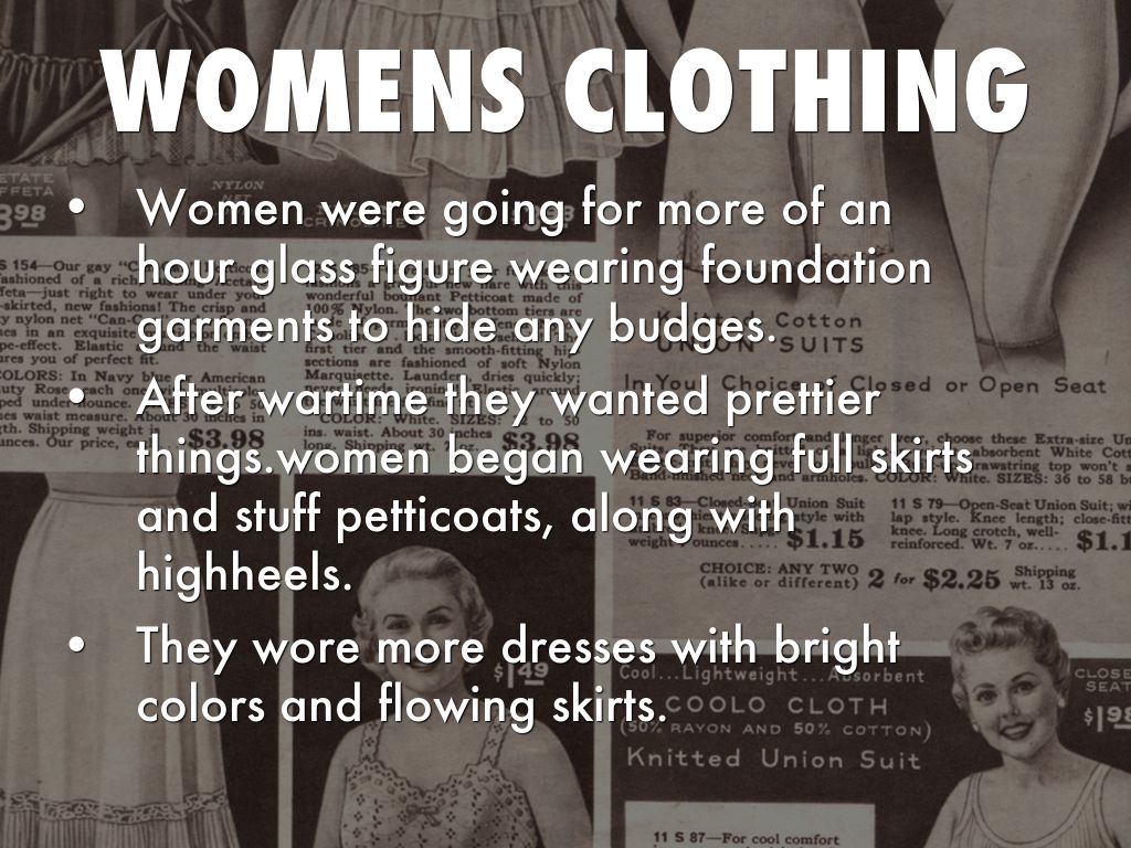 Women were going for more of an hour glass figure wearing foundation garments to hide any budges.