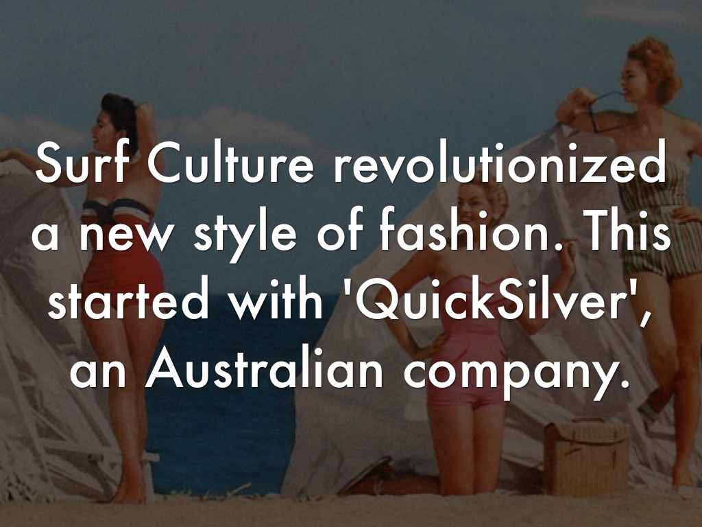 Surf Culture revolutionized a new style of fashion. This started with 'QuickSilver', an Australian company.