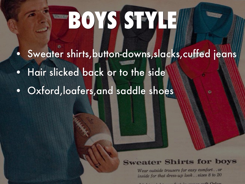 Sweater shirts,button-downs,slacks,cuffed jeans