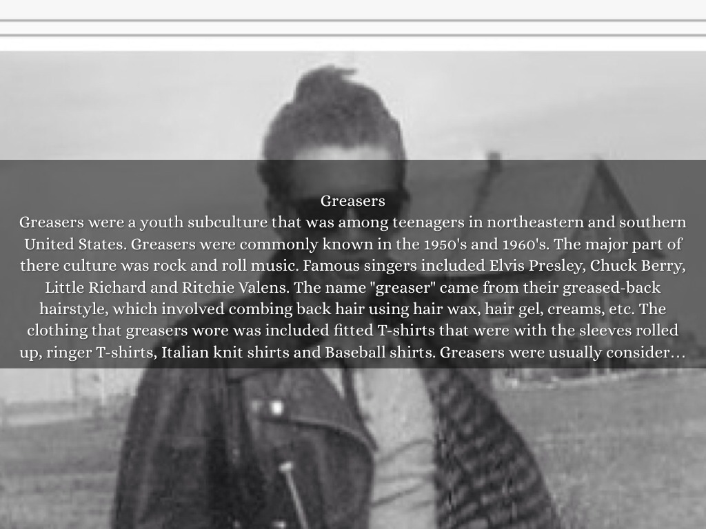 Greasers were a youth subculture that was among teenagers in northeastern and southern United States. Greasers were commonly known in the 1950's and 1960's. The major part of there culture was rock and roll music. Famous singers included Elvis Presley, Chuck Berry, Little Richard and Ritchie Valens. The name "greaser" came from their greased-back hairstyle, which involved combing back hair using hair wax, hair gel, creams, etc. The clothing that greasers wore was included fitted T-shirts that were with the sleeves rolled up, ringer T-shirts, Italian knit shirts and Baseball shirts. Greasers were usually considered as urban working class ethnics.