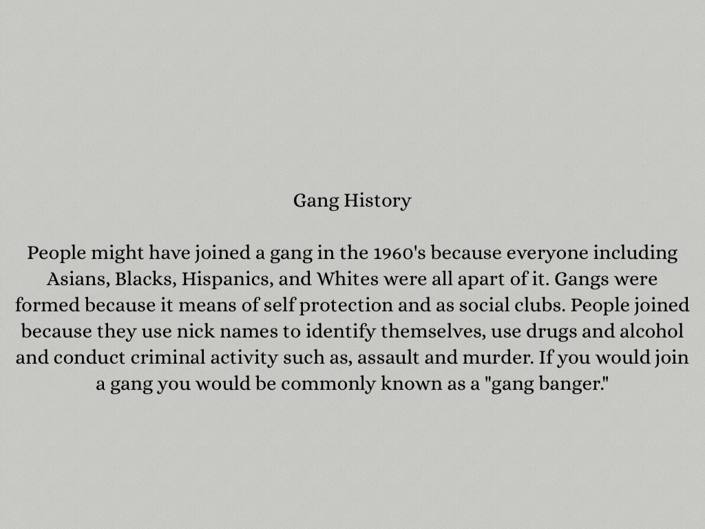 People might have joined a gang in the 1960's because everyone including Asians, Blacks, Hispanics, and Whites were all apart of it. Gangs were formed because it means of self protection and as social clubs. People joined because they use nick names to identify themselves, use drugs and alcohol and conduct criminal activity such as, assault and murder. If you would join a gang you would be commonly known as a "gang banger."