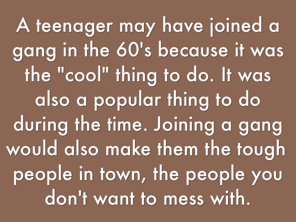 A teenager may have joined a gang in the 60's because it was the "cool" thing to do. It was also a popular thing to do during the time. Joining a gang would also make them the tough people in town, the people you don't want to mess with.