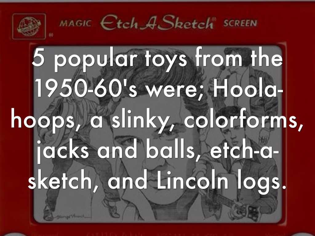 5 popular toys from the 1950-60's were; Hoola-hoops, a slinky, colorforms, jacks and balls, etch-a-sketch, and Lincoln logs.