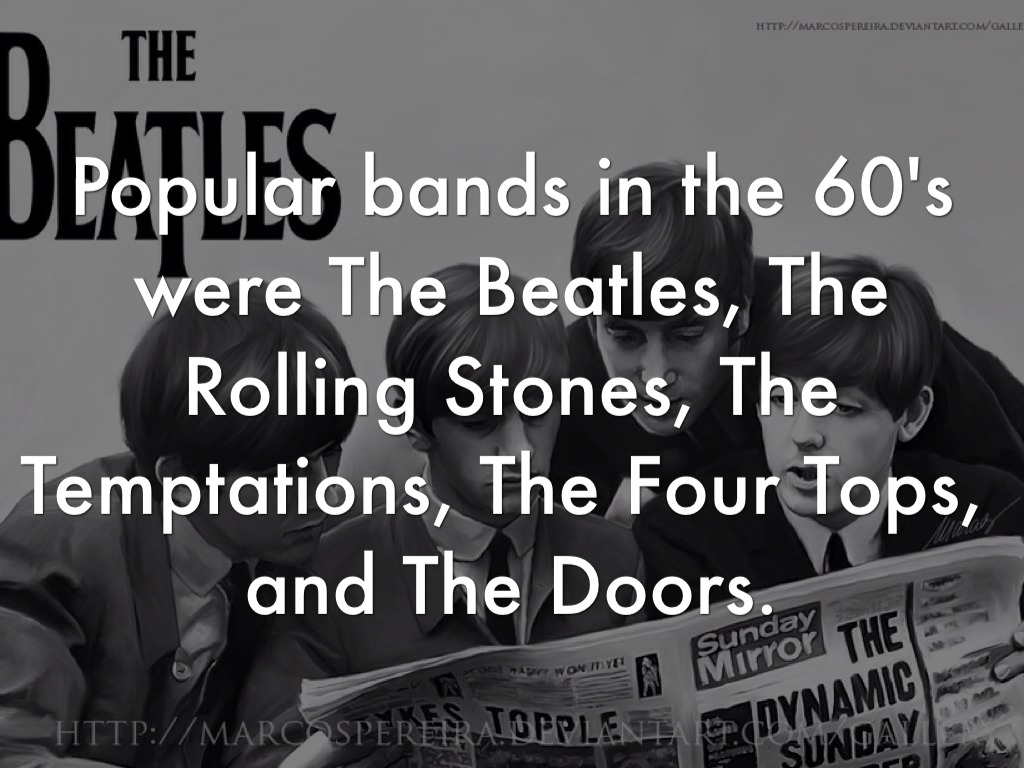 Popular bands in the 60's were The Beatles, The Rolling Stones, The Temptations, The Four Tops, and The Doors.