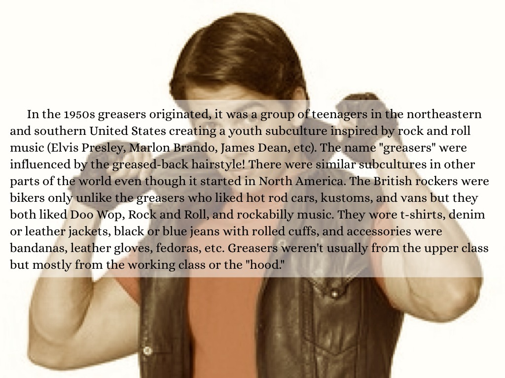 In the 1950s greasers originated, it was a group of teenagers in the northeastern and southern United States creating a youth subculture inspired by rock and roll music (Elvis Presley, Marlon Brando, James Dean, etc). The name "greasers" were influenced by the greased-back hairstyle! There were similar subcultures in other parts of the world even though it started in North America. The British rockers were bikers only unlike the greasers who liked hot rod cars, kustoms, and vans but they both liked Doo Wop, Rock and Roll, and rockabilly music. They wore t-shirts, denim or leather jackets, black or blue jeans with rolled cuffs, and accessories were bandanas, leather gloves, fedoras, etc. Greasers weren't usually from the upper class but mostly from the working class or the "hood."