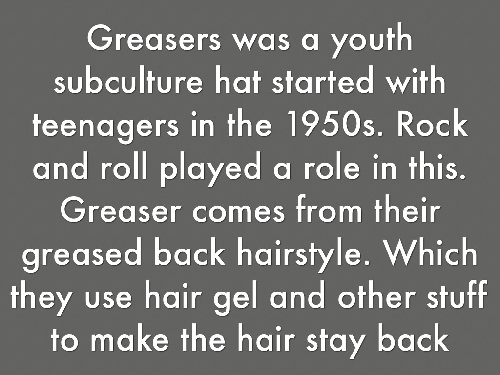 Greasers was a youth subculture hat started with teenagers in the 1950s. Rock and roll played a role in this. Greaser comes from their greased back hairstyle. Which they use hair gel and other stuff to make the hair stay back