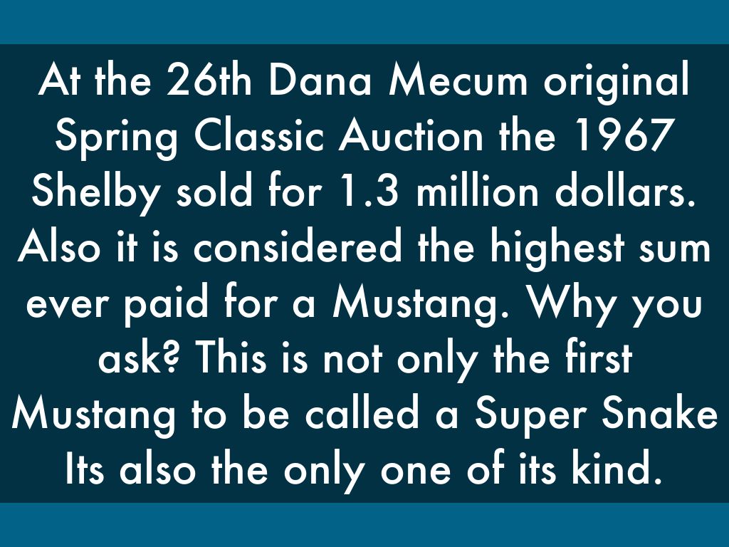At the 26th Dana Mecum original Spring Classic Auction the 1967 Shelby sold for 1.3 million dollars. Also it is considered the highest sum ever paid for a Mustang. Why you ask? This is not only the first Mustang to be called a Super Snake Its also the only one of its kind.