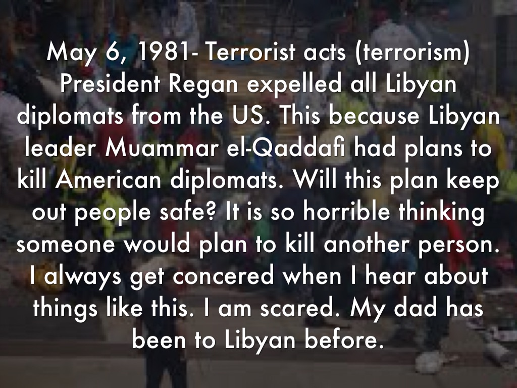 May 6, 1981- Terrorist acts (terrorism) President Regan expelled all Libyan diplomats from the US. This because Libyan leader Muammar el-Qaddafi had plans to kill American diplomats. Will this plan keep out people safe? It is so horrible thinking someone would plan to kill another person. I always get concered when I hear about things like this. I am scared. My dad has been to Libyan before.