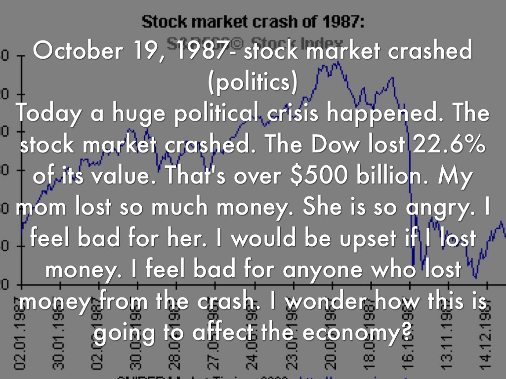 Today a huge political crisis happened. The stock market crashed. The Dow lost 22.6% of its value. That's over $500 billion. My mom lost so much money. She is so angry. I feel bad for her. I would be upset if I lost money. I feel bad for anyone who lost money from the crash. I wonder how this is going to affect the economy?