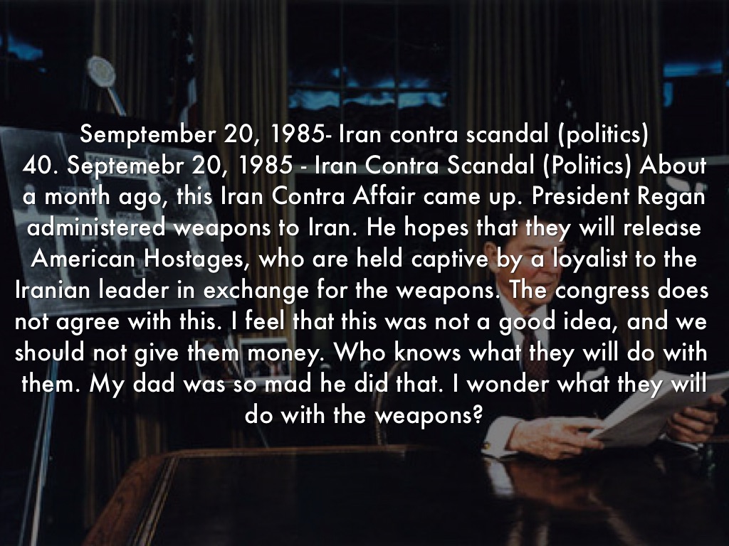 40. Septemebr 20, 1985 - Iran Contra Scandal (Politics) About a month ago, this Iran Contra Affair came up. President Regan administered weapons to Iran. He hopes that they will release American Hostages, who are held captive by a loyalist to the Iranian leader in exchange for the weapons. The congress does not agree with this. I feel that this was not a good idea, and we should not give them money. Who knows what they will do with them. My dad was so mad he did that. I wonder what they will do with the weapons?