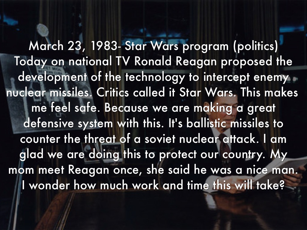 Today on national TV Ronald Reagan proposed the development of the technology to intercept enemy nuclear missiles. Critics called it Star Wars. This makes me feel safe. Because we are making a great defensive system with this. It's ballistic missiles to counter the threat of a soviet nuclear attack. I am glad we are doing this to protect our country. My mom meet Reagan once, she said he was a nice man. I wonder how much work and time this will take?