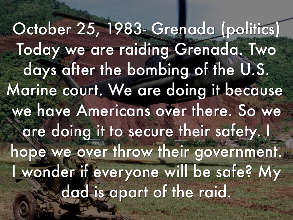 Today we are raiding Grenada. Two days after the bombing of the U.S. Marine court. We are doing it because we have Americans over there. So we are doing it to secure their safety. I hope we over throw their government. I wonder if everyone will be safe? My dad is apart of the raid.