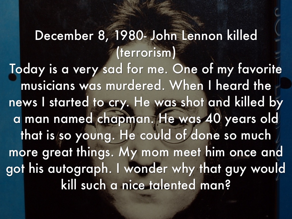 Today is a very sad for me. One of my favorite musicians was murdered. When I heard the news I started to cry. He was shot and killed by a man named chapman. He was 40 years old that is so young. He could of done so much more great things. My mom meet him once and got his autograph. I wonder why that guy would kill such a nice talented man?