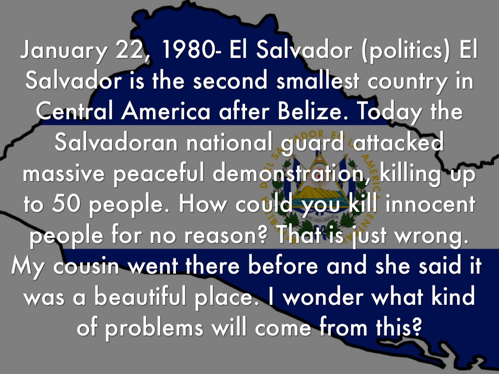 January 22, 1980- El Salvador (politics) El Salvador is the second smallest country in Central America after Belize. Today the Salvadoran national guard attacked massive peaceful demonstration, killing up to 50 people. How could you kill innocent people for no reason? That is just wrong. My cousin went there before and she said it was a beautiful place. I wonder what kind of problems will come from this?