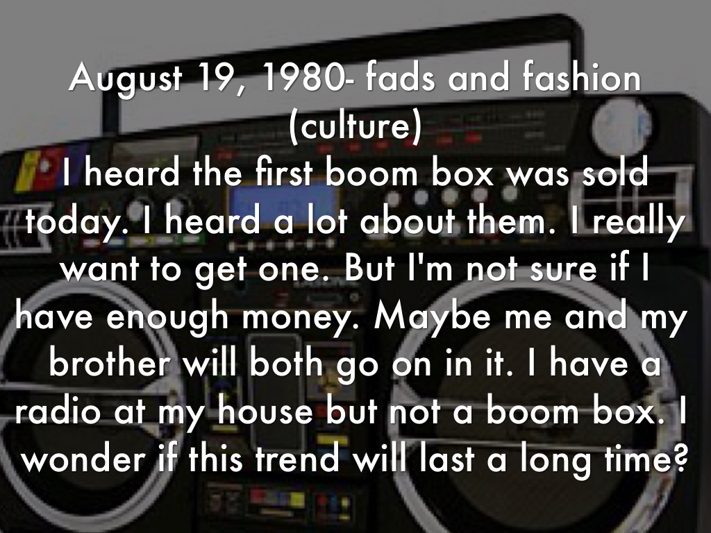 I heard the first boom box was sold today. I heard a lot about them. I really want to get one. But I'm not sure if I have enough money. Maybe me and my brother will both go on in it. I have a radio at my house but not a boom box. I wonder if this trend will last a long time?