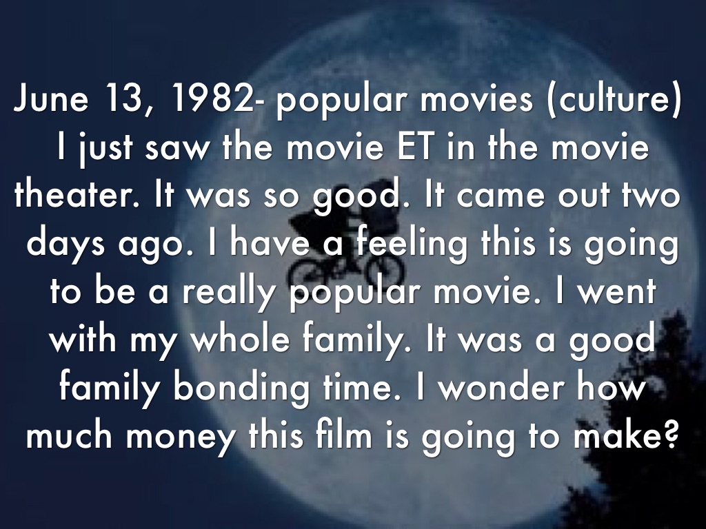 I just saw the movie ET in the movie theater. It was so good. It came out two days ago. I have a feeling this is going to be a really popular movie. I went with my whole family. It was a good family bonding time. I wonder how much money this film is going to make?