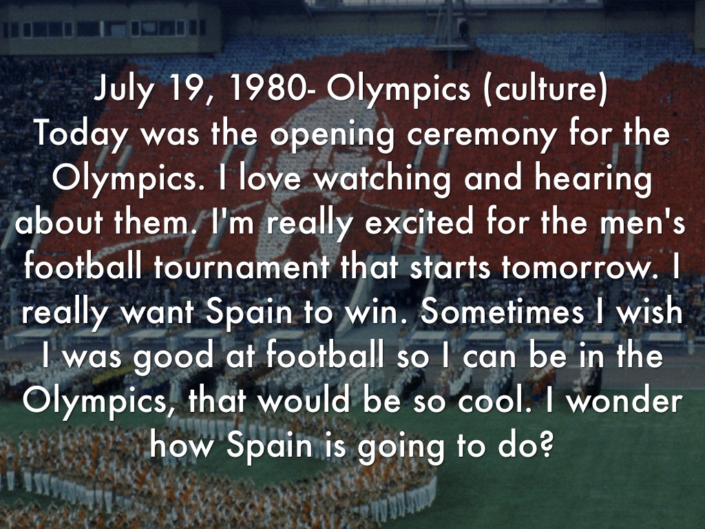 Today was the opening ceremony for the Olympics. I love watching and hearing about them. I'm really excited for the men's football tournament that starts tomorrow. I really want Spain to win. Sometimes I wish I was good at football so I can be in the Olympics, that would be so cool. I wonder how Spain is going to do?