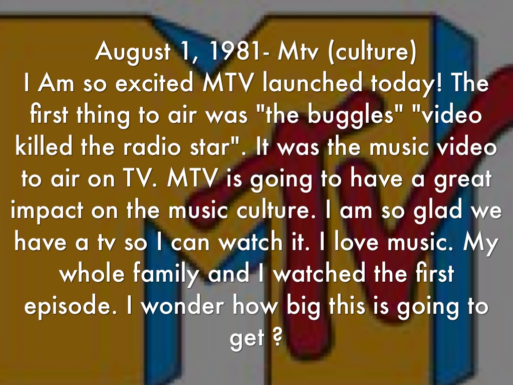 I Am so excited MTV launched today! The first thing to air was "the buggles" "video killed the radio star". It was the music video to air on TV. MTV is going to have a great impact on the music culture. I am so glad we have a tv so I can watch it. I love music. My whole family and I watched the first episode. I wonder how big this is going to get ?