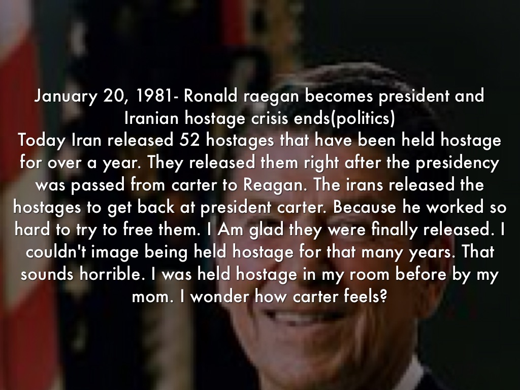 Today Iran released 52 hostages that have been held hostage for over a year. They released them right after the presidency was passed from carter to Reagan. The irans released the hostages to get back at president carter. Because he worked so hard to try to free them. I Am glad they were finally released. I couldn't image being held hostage for that many years. That sounds horrible. I was held hostage in my room before by my mom. I wonder how carter feels?