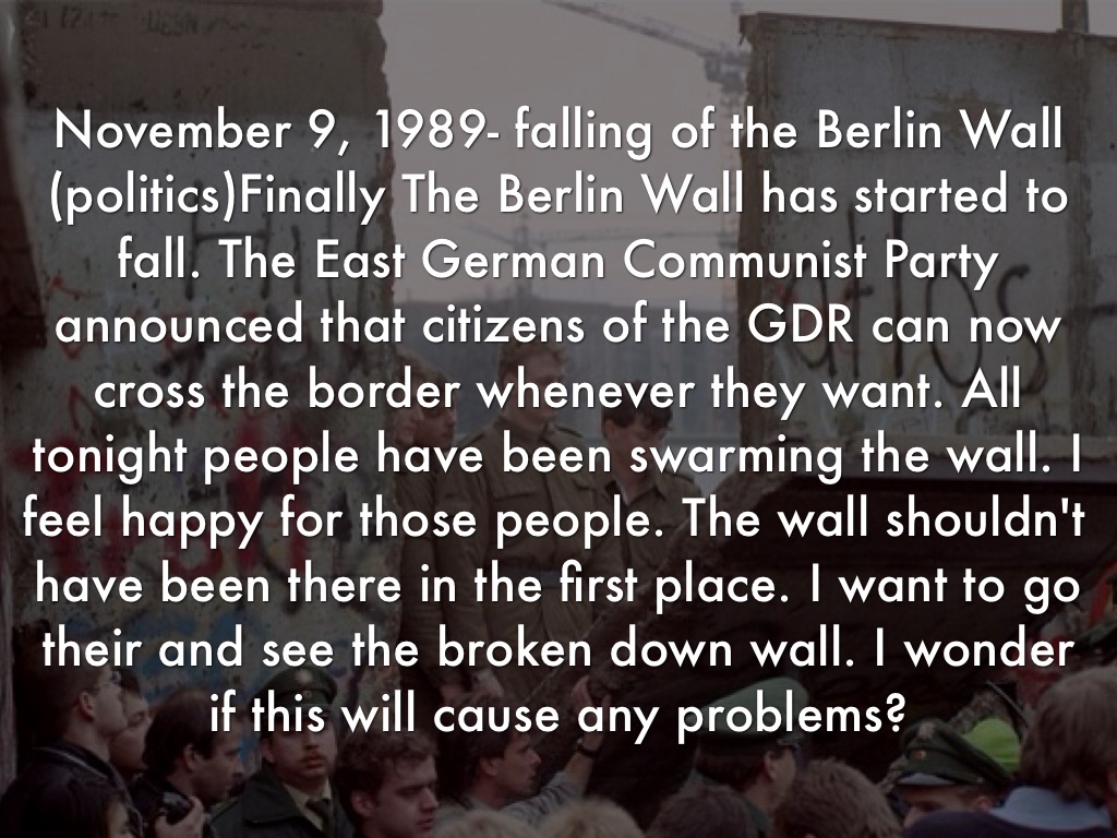 November 9, 1989- falling of the Berlin Wall (politics)Finally The Berlin Wall has started to fall. The East German Communist Party announced that citizens of the GDR can now cross the border whenever they want. All tonight people have been swarming the wall. I feel happy for those people. The wall shouldn't have been there in the first place. I want to go their and see the broken down wall. I wonder if this will cause any problems?