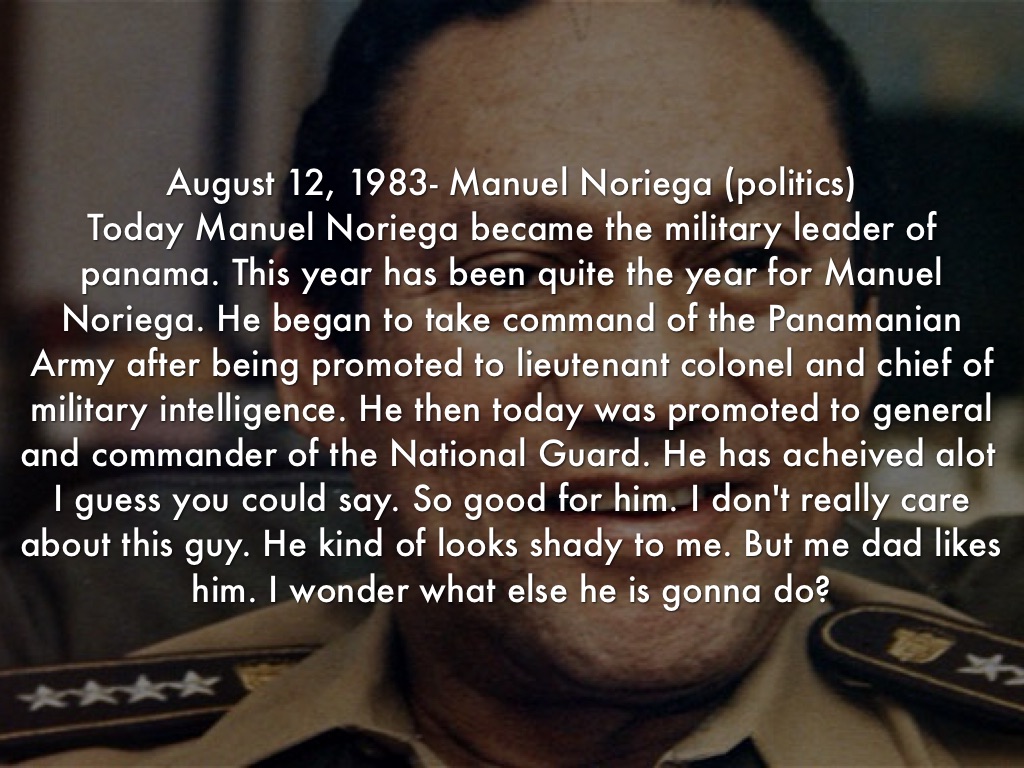 Today Manuel Noriega became the military leader of panama. This year has been quite the year for Manuel Noriega. He began to take command of the Panamanian Army after being promoted to lieutenant colonel and chief of military intelligence. He then today was promoted to general and commander of the National Guard. He has acheived alot I guess you could say. So good for him. I don't really care about this guy. He kind of looks shady to me. But me dad likes him. I wonder what else he is gonna do?